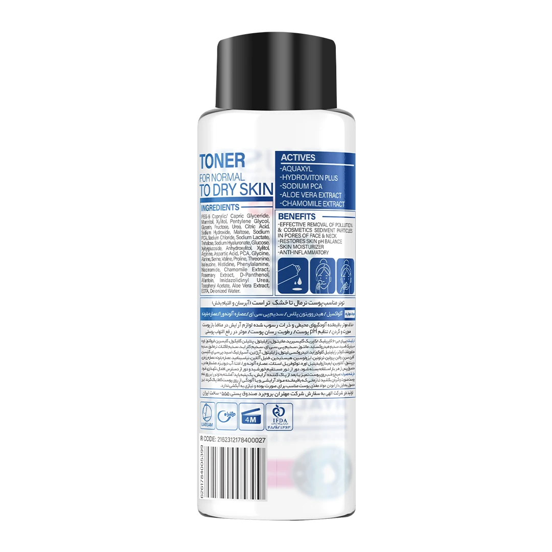 تونر مناسب پوست نرمال تا خشک تراست، با داشتن ماده آکواکسیل در ترکیبات خود، پوست را آبرسانی کرده و با ایجاد یک سد دفاعی روی پوست، مانعِ از دست دادن آب پوستی میشود. هیدروویتون پلاس در این محصول، مرطوبکننده قوی پوست بوده و سدیم پی سی ای این تونر از خشکی پوست جلوگیری میکند. همچنین عصاره بابونه در این ترکیب از آسیب رادیکالهای آزاد به پوست جلوگیری کرده و عصاره آلوئهورا التهابات پوستی را کاهش میدهد.