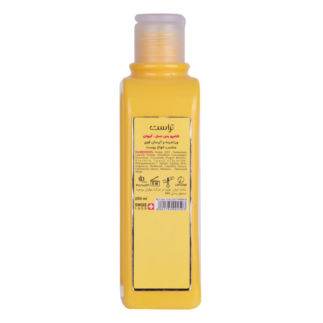 شامپو بدن عسل و Q10 تراست، حاوی عسل است که لایه رویی پوست را آبرسانی میکند و چین و چروکهای پوست را کاهش میدهد. همچنین این شامپو بدن با داشتن کوآنزیم کیوتن به تقویت سد دفاعی پوست کمک میکند و جلوی آسیب پرتوهای UV خورشید را میگیرد. عصاره بابونه موجود در این محصول ضدالتهاب و روشنکننده پوست است.