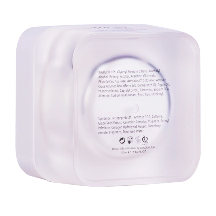 عملکرد سفتکنندگی و لیفتینگ پوست صورت با داشتن ترکیبات فعال بهبود دهنده کشسانی و مقاومت پوست مثل عصاره سلول بنیادی رز آلپ، BeautiFerm Lift، سدیم هیالورونات، رتینیل پالمیتات، سیمدتوکس، روغن آرگان، شیباتر، تتراپپتاید-۲۱، کمپلکس سرامید، ویوندین و پروتئین کلاژن هیدرولیز شده